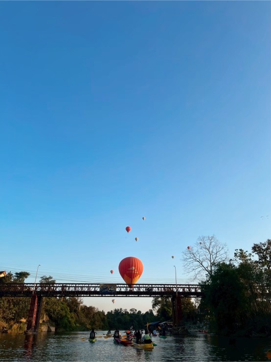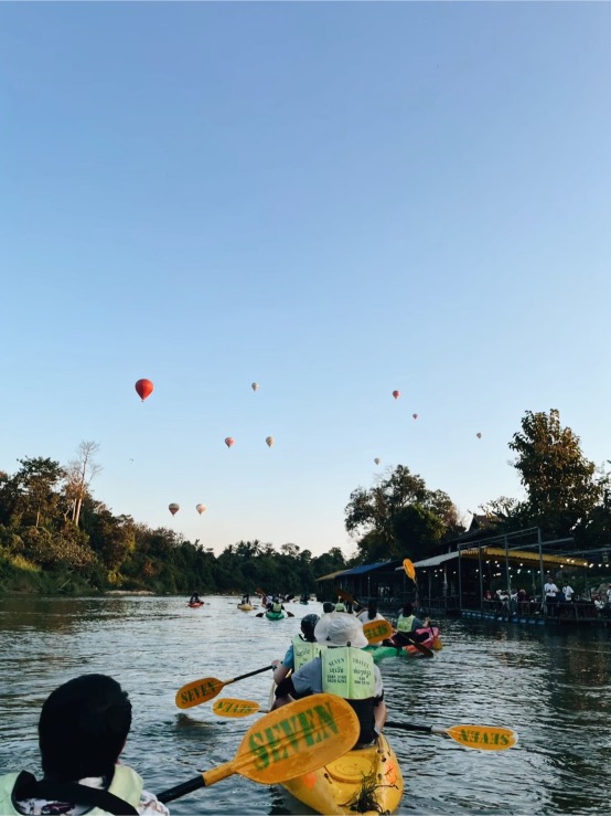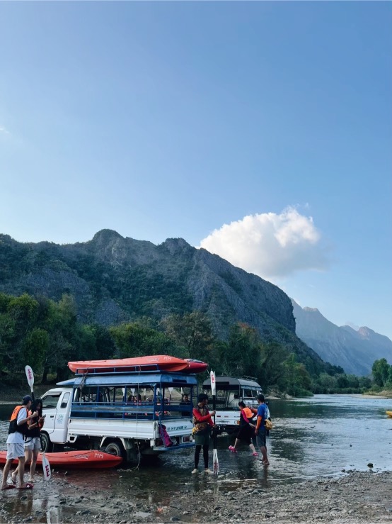- 15.30 น. ออกจาก Blue Lagoon ทำกิจกรรม พายเรือคายักไปตามแม่น้ำซอง ซึ่งไหลผ่านภูเขาหินปูน ทุ่งนา และหมู่บ้าน